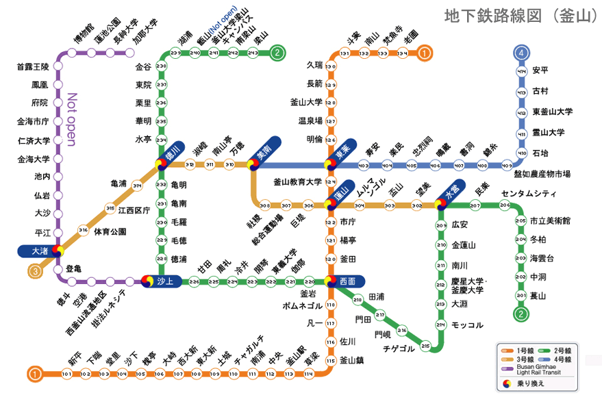釜山駅やチャガルチ駅、南浦洞(ナンポドン)駅など釜山の人気観光地を通る。
