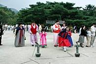 かつては村祭りの時に力自慢の者が集まって行われていた伝統競技。当時はシルム優勝者に織物や米、子牛といった庶民には嬉しい商品が与えられていました。現在シルムはプロ化され、1対1のトーナメント方式の「天下壮士シルム大会」が行われ、全国一のシルム王を決めるイベントが行われます。 カンガンスルレは数十人の女性が手をつないで輪になって踊る踊り。 この踊りは文禄・慶長の役の際、李舜臣(イ・スンシン)将軍のとった戦術と関連があります。 李将軍は女性たちを集め、軍服を着せて集団で山の峰で踊らせました。 それを遠くから見ていた豊臣軍に、韓国側は大勢の兵士を率いていると錯覚させ、混乱を招き勝利を得たと伝えられています。