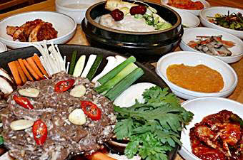 お昼時や女性の方にお勧めなのがやはりサムゲタン。スープの中には高麗人参やナツメなど体にいい材料がいっぱいはいってますので、食べ終わるころには体がポカポカしていきます。 サムゲタンを食べるときには高麗人参酒もごいっしょにどうぞ。ショッピングや観光での疲れを癒してくれます。