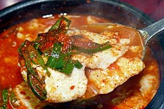純豆腐(スンドゥブ)をアサリでダシをとった辛いスープで煮込んだ料理。