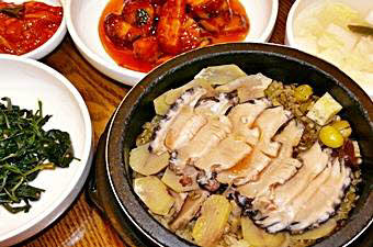 アワビのお粥のほかにもうひとつの大人気メニューがアワビの石焼ご飯(チョンボッドルソッバ)です。こちらもアワビがふんだんに使われており香ばしい海の香りが口の中に広がります。しかもウニ入りワカメスープがついてくる。こちらもおススメです。