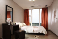 ロイヤルスイートは広さ約54坪と更に快適な広さとなっており、3つのベッドルーム、2つのバスルーム、リビングルームにダイニング、更にテラスも準備されています。客室の様子は下の客室平面図をご参考ください。リゾート内にはプライベートビーチ、プール、イベントホール、PCルーム、各種レストラン、ドーナツショップ、お土産ショップなど様々な付帯施設が揃っています。特にクラブハウス2階にある創作レストラン「Mint(ミント」は店内全体がガラス張りとなり素晴らしい海の眺めを見ながら食事ができる人気の高いレストランで、韓国版「花より男子」のロケにも使われました。このクラブハウスは日本人建築家.安藤忠雄氏が設計し、日本からわざわざ訪れる方もいらっしゃるそうです。「Mint」は予約制となっており、レストランまではコンドミニアムのある建物前からシャトルバスも運行されています。