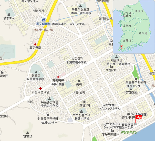 • 木浦(モッポ)バスターミナル : からホテルまで タクシーで 5分所要。